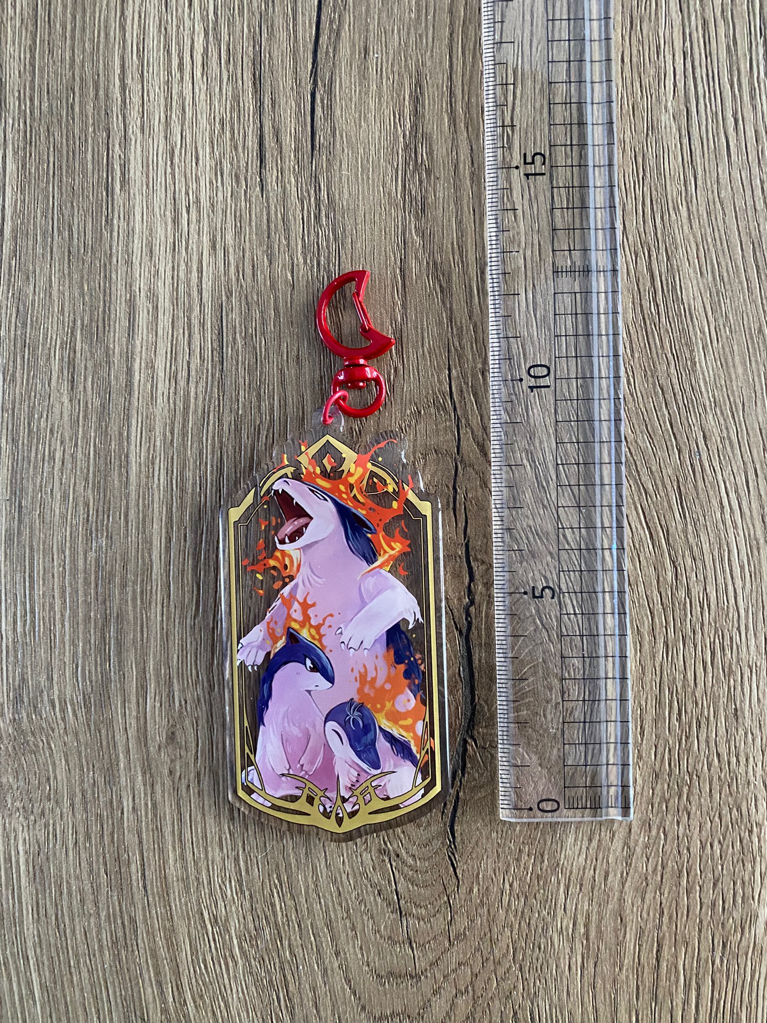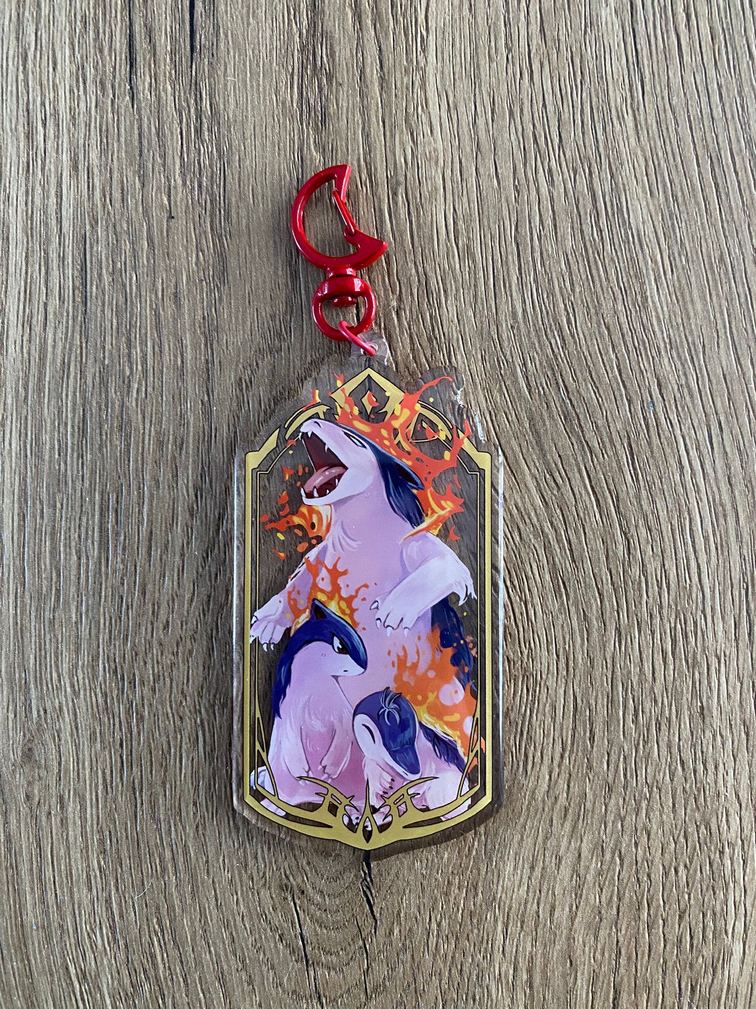 Dit is een charm (extra grote sleutelhanger). Deze charm heeft het ontwerp de beroemde vuur pokémon, de starter cyndaquil, Quilava & Thypolosion.